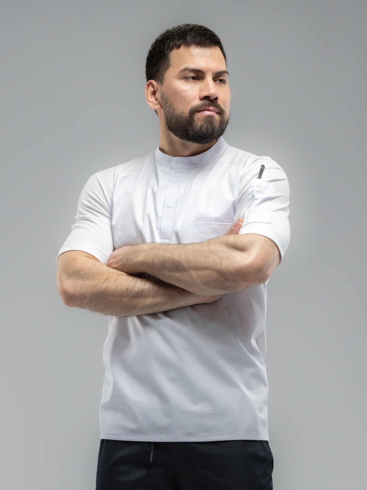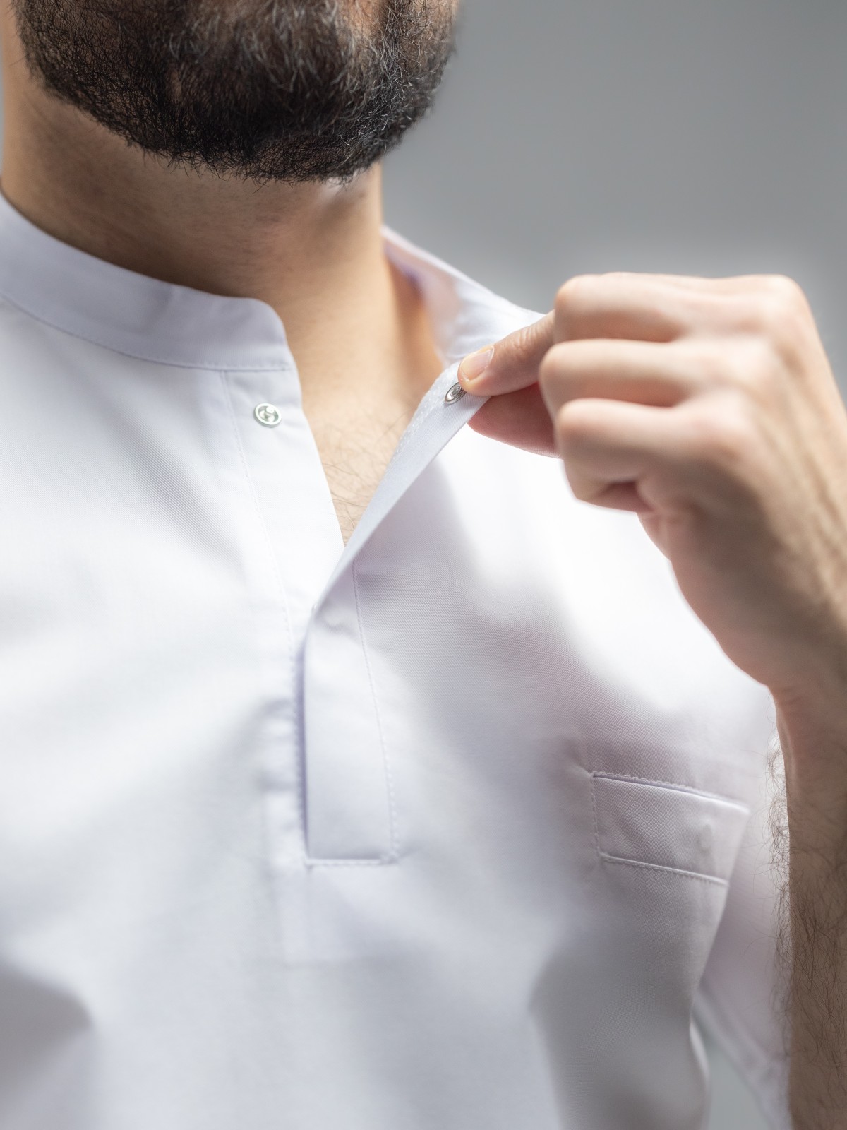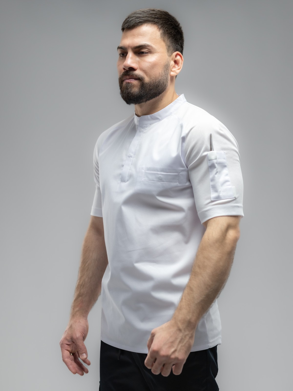 • Удобные потайные застежки-кнопки из нержавеющего металла надежно фиксируют поварской китель.