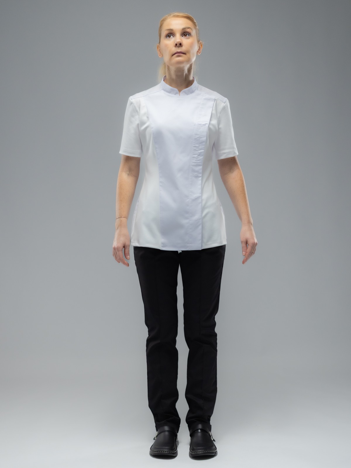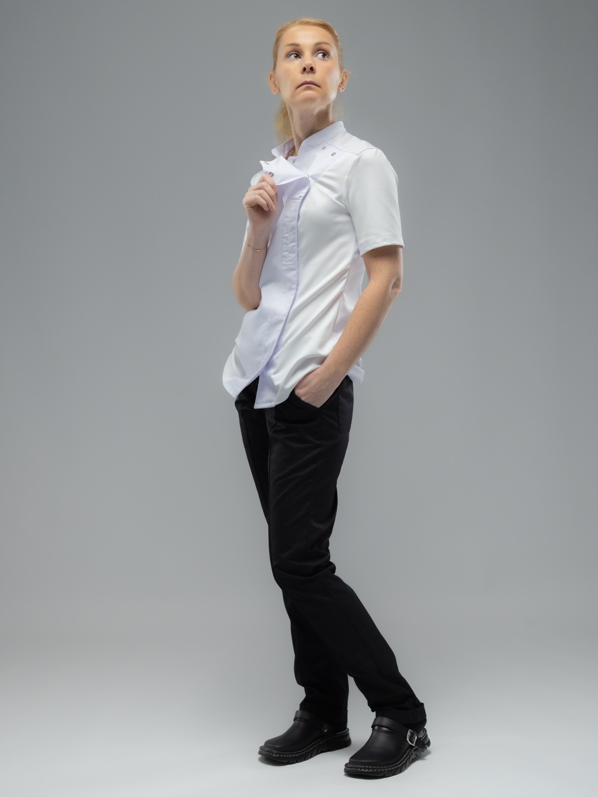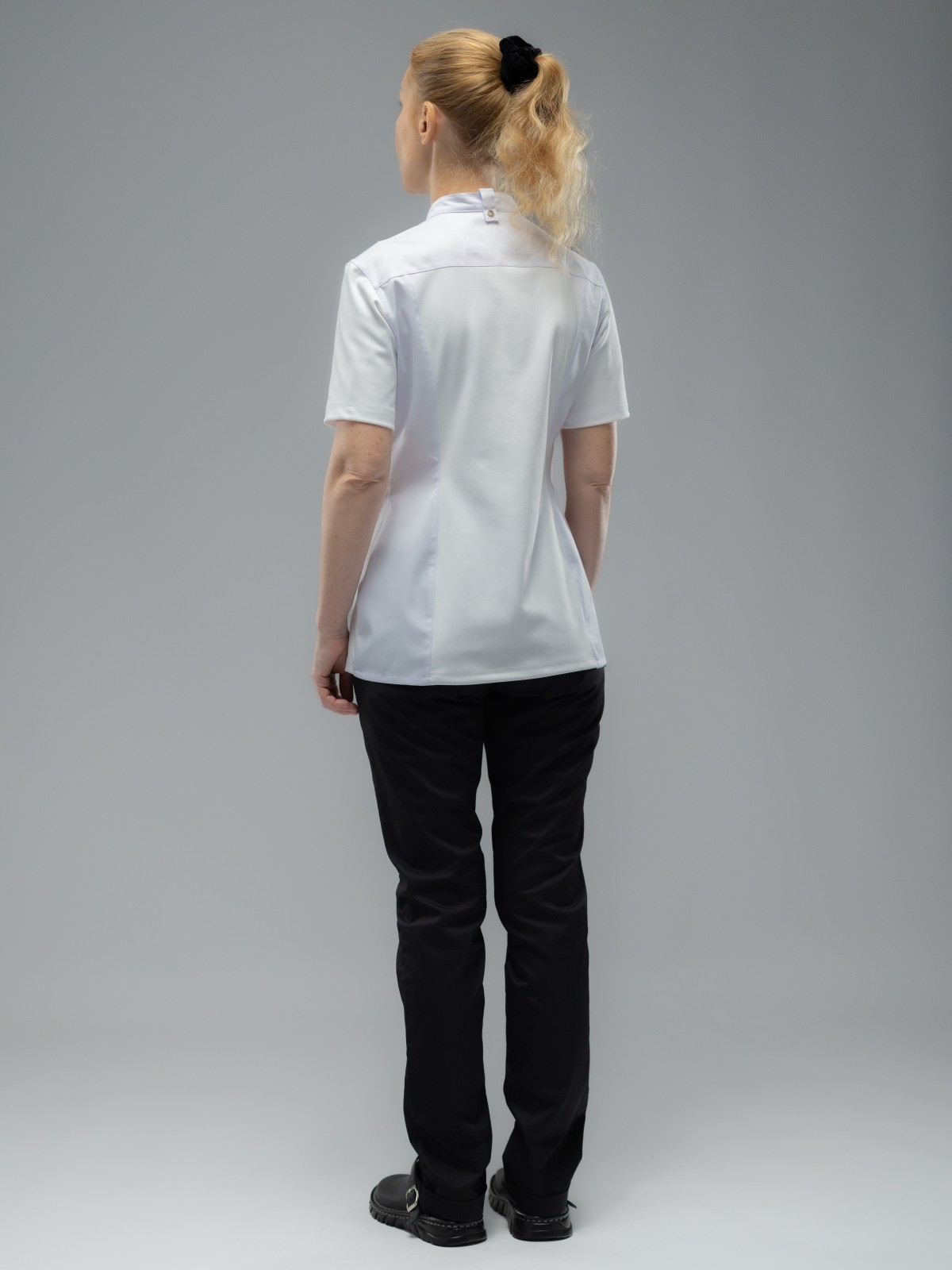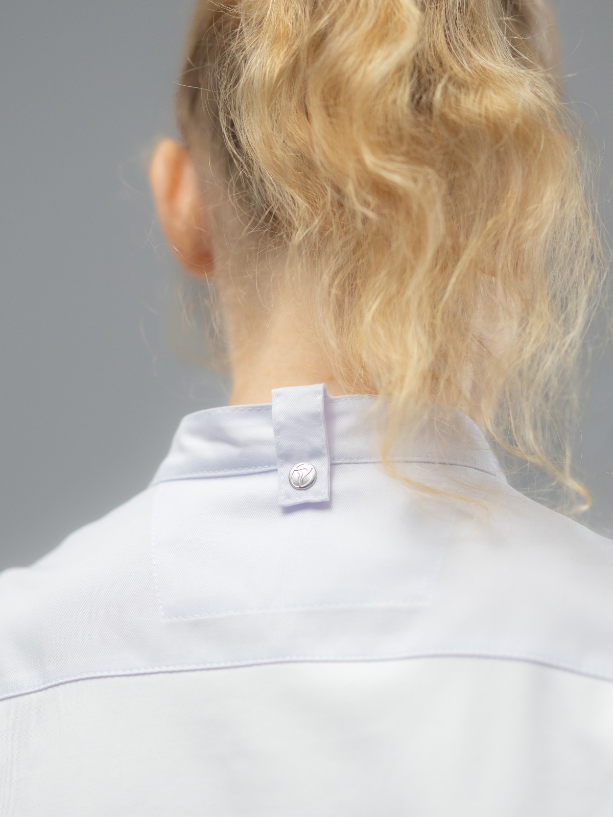 • Удобные потайные застежки-кнопки из нержавеющего металла надежно фиксируют поварской китель.